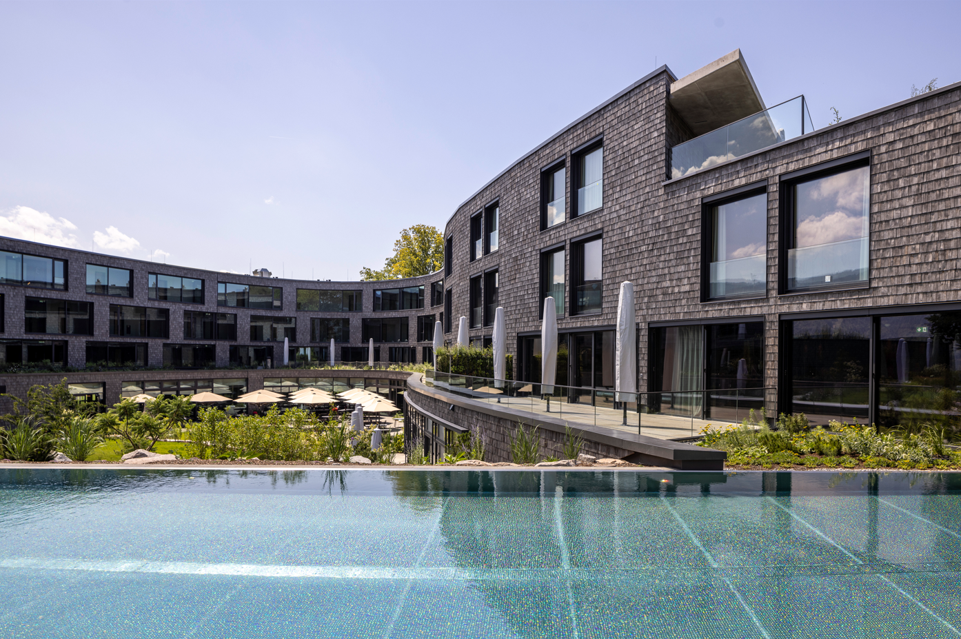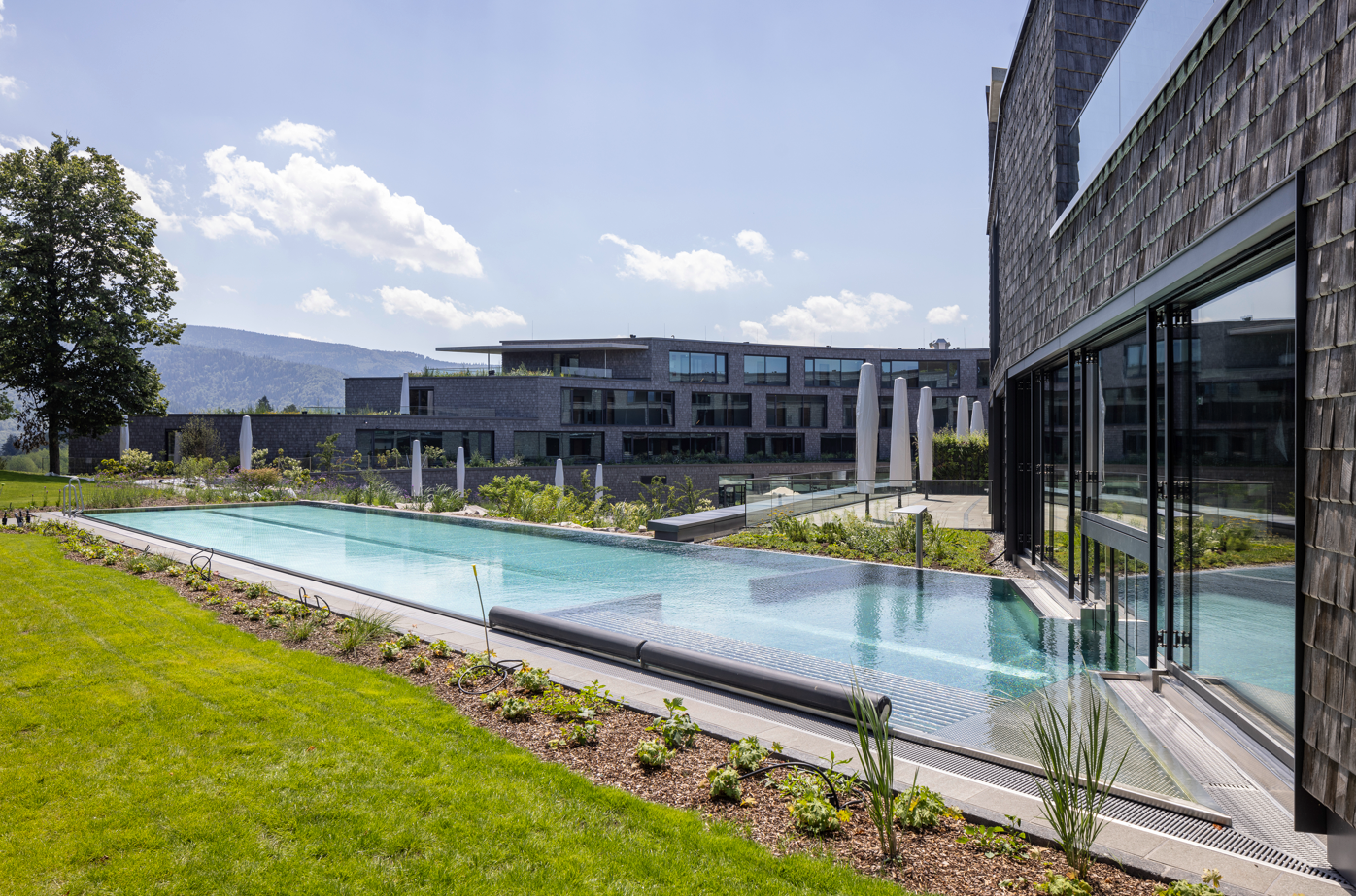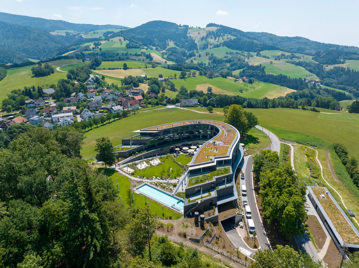 Der sensible Umgang mit der Natur sowie die Berücksichtigung des wertvollen Baumbestandes einerseits und die Ausnutzung der grandiosen Panoramasituation andererseits, führten zu einem zurückhaltenden und in der Höhenentwicklung angemessenen Gebäudekörper, der sich durch seine freie Form harmonisch in die Natur integriert und an den Nahtstellen mit ihr verschmilzt. Der Erhalt der besonderen Baumgruppe im Südwesten (zwei stattliche Linden und eine alte Eiche) als Fixpunkt für dieses Areal war der Ausgangspunkt für die Entwicklung des Gebäudekonzeptes. Durch das Zurücksetzen des Baukörpers hinter diese Baumgruppe wird die prägende Silhouette der Natur erhalten. Sowohl die „Fernsicht“ aus Horben, wie auch die Sicht des ankommenden Gastes werden dadurch wohltuend begleitet. Die aus den vorhandenen Höhenverläufen entwickelte freie Form des dynamischen Baukörpers ermöglicht eine optimale Ausrichtung aller Zimmer: vom Schwarzwald im Osten, über die Gebirgsausläufer (Frauenhemd) im Süden bis in die Rheinebene im Westen und Norden. Durch die geplante Durchmischung der ein- und zweibündigen inneren Erschließung entstehen zwei attraktive helle und übersichtliche Zimmergeschosse mit grandiosen Ausblicken in die Natur. Das zurückgesetzte Attikageschoss duckt sich in die Bergkuppe und wirkt dadurch angenehm auf die Höhenentwicklung, die nach wie vor durch den bestehenden Baumbestand bestimmt wird. Hotelvorfahrt und Erschließung liegen westlich, in unmittelbarer Nähe zur Tiefgarage. Hierdurch wird die beste Panoramalage mit seinen Terrassen und den Linden freigestellt und nicht durch den Verkehr gestört. Die funktionale Anordnung des Sport-, Natur- und Gesundheitsbereiches entwickelt sich im Norden mit herrlichem Blick in die Rheinebene und den Schwarzwald.